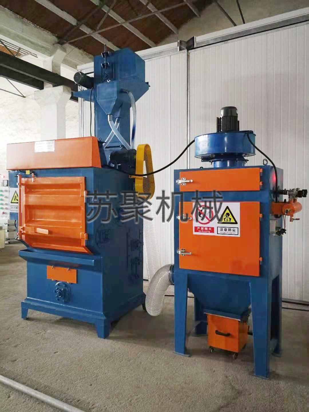 在清理室中加入規定數量的工件,機器啟動(dòng)后,滾筒開(kāi)始旋轉,被清理的工件由橡膠履帶帶動(dòng)在滾筒內作連續均勻的翻轉,同時(shí)拋丸器高效拋出彈丸形成扇形彈束,均勻的打在工件表面上,從而達到清理和強化的目的。拋出的彈丸及砂粒,經(jīng)橡膠履帶均勻排布的小孔流入清理室底部的鋼板篩上,鋼板篩將較大顆粒篩出鋼丸及細砂落至篩下的螺旋輸送器,被送入提升機內,由提升機提至丸砂分離器中進(jìn)行分離,粉塵由風(fēng)機吸送至濾筒式除塵器內經(jīng)濾筒過(guò)濾,清潔空氣排放大氣,濾筒上的灰塵有脈沖反吹落入除塵器下部集塵箱內,定期除塵。舊砂經(jīng)流砂管流入廢砂桶內(用戶(hù)自備)。由分離器中鋼板篩篩下的較大顆粒與未能分離完成的丸砂混合物,經(jīng)流丸管流入清理室。重新參加分離,分離后干凈的彈丸,經(jīng)流丸管再次流入拋丸器內重新開(kāi)始拋丸工作。