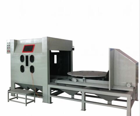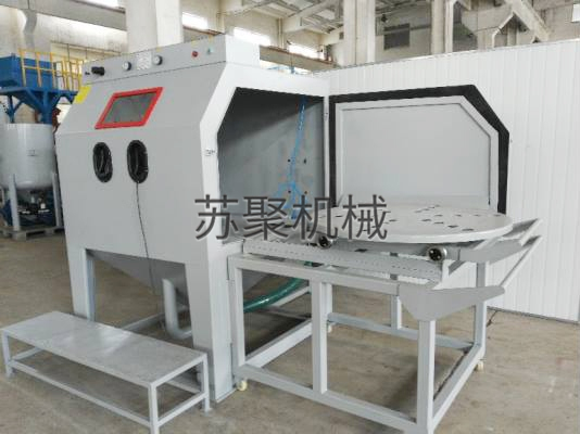 操作時(shí)將工件放置在臺車(chē)轉盤(pán)上,將臺車(chē)推入噴砂艙,即可關(guān)上艙門(mén)開(kāi)始噴砂工作。