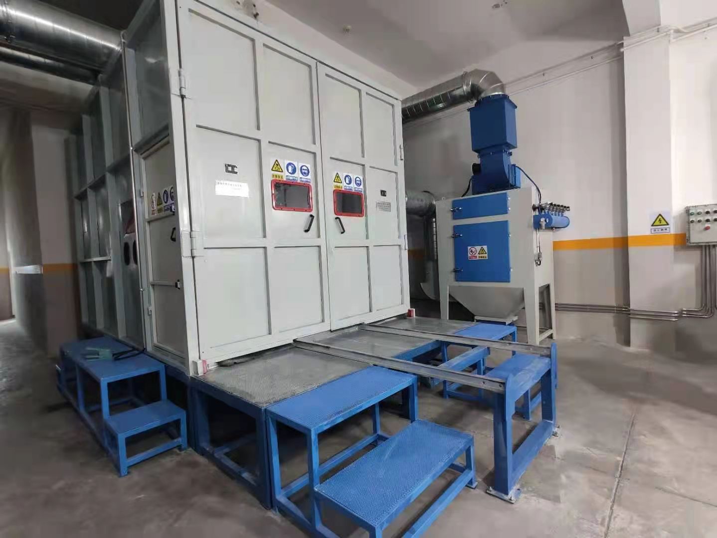 6.噴砂室體采用了上部進(jìn)風(fēng),下部和側部均可進(jìn)行吸風(fēng)的抑塵循環(huán)方式。粉塵始終向下引流,室內能見(jiàn)度高,員工操作環(huán)境好,同時(shí)保護了工人健康;